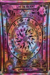 Ta mandala łączy astrologię, porządek natury i duchowe przesłanie, tworząc symboliczny przewodnik po życiu. Znaki zodiaku rozmieszczone wokół kompasu reprezentują wpływy kosmiczne, które kształtują osobowość i los, a otaczające je hasła – „Ucz się z przeszłości”, „Żyj teraźniejszością”, „Twórz przyszłość” – podkreślają ideę życia w harmonii z cyklami wszechświata.