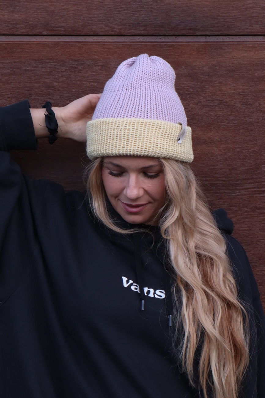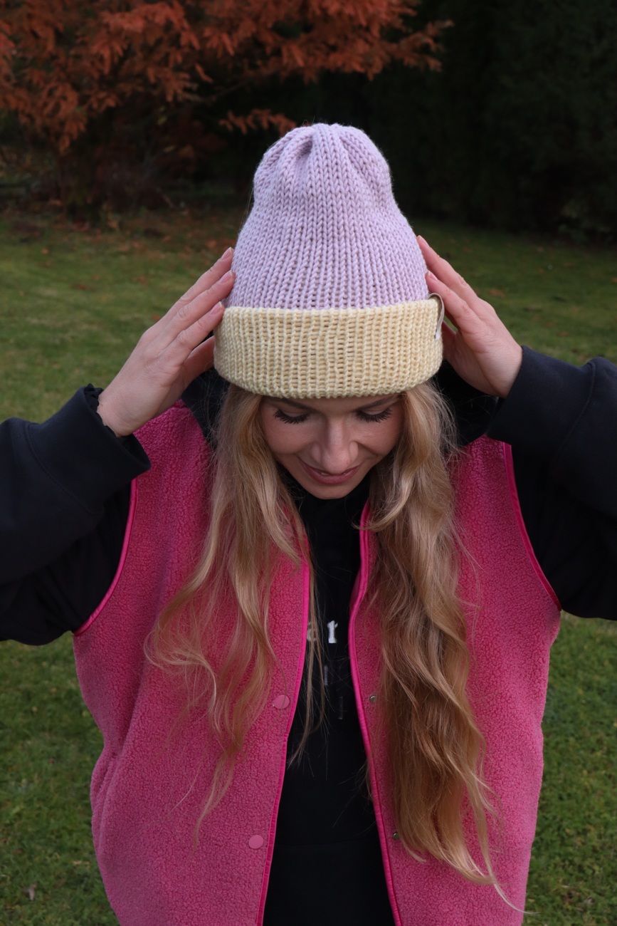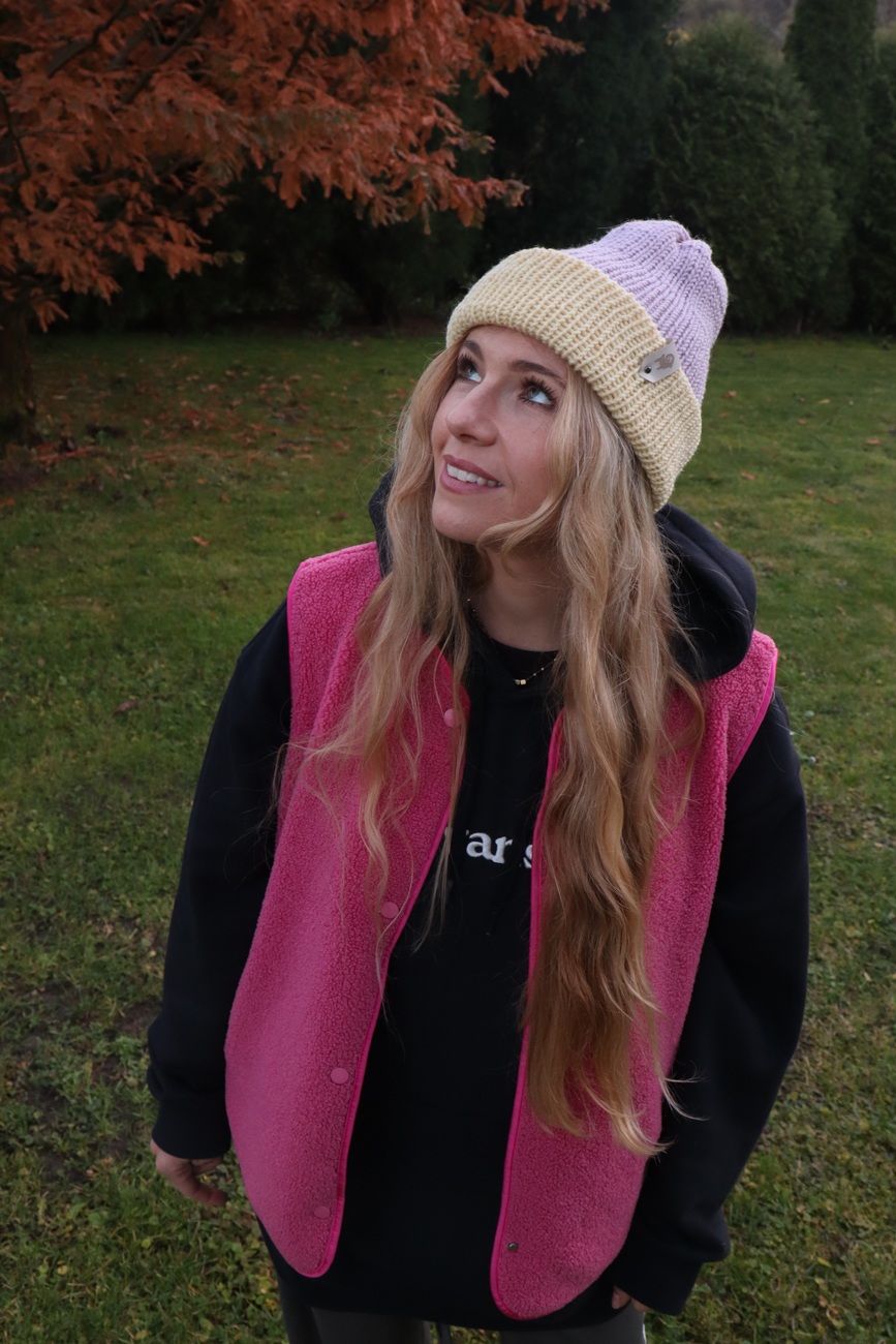 Czapka jest dwustronna – wystarczy wywinąć ją na drugą stronę, a zyskasz nowy look w masełkowym kolorze!