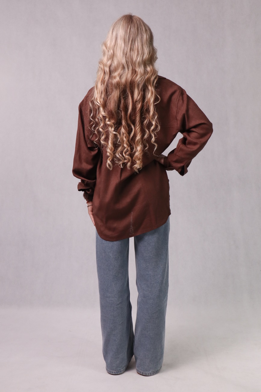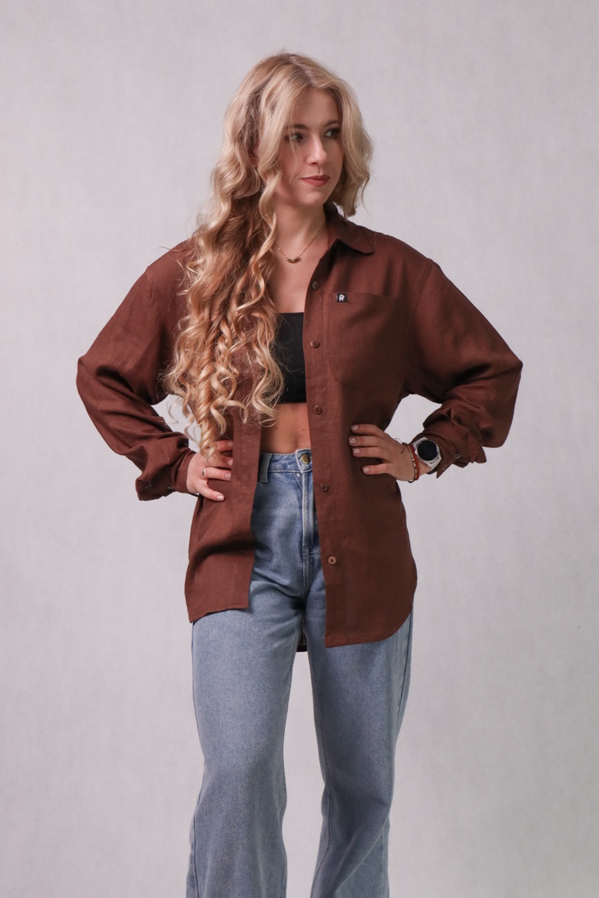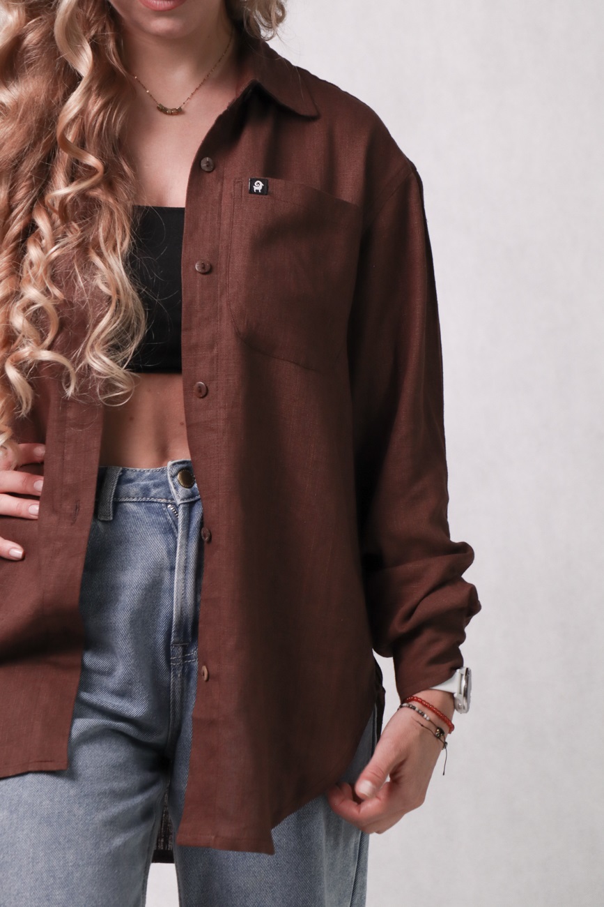 Koszula damska oversize z lnu, bawełny i wiskozy, brązowa