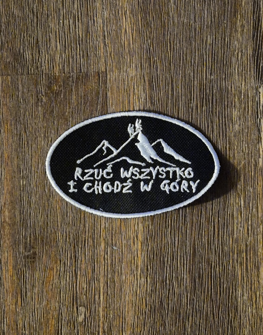 Naszywka owalna RZUĆ WSZYSTKO I CHODŹ W GÓRY czarna
