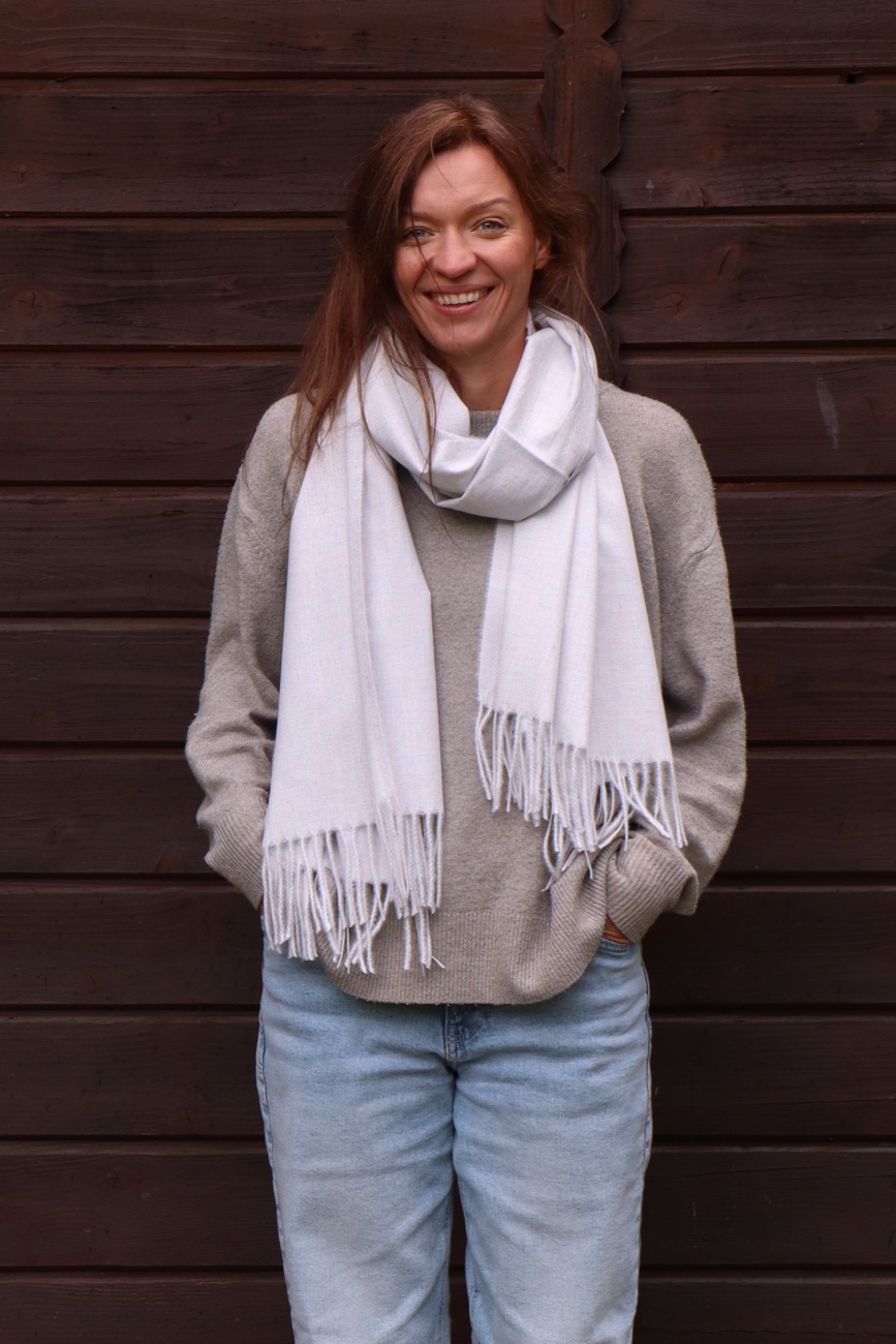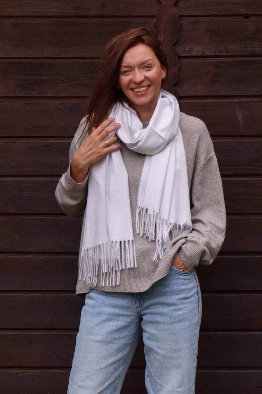 Delikatna kremowa baza przełamana niebieskim pigmentem tworzy wyjątkowo eleganckie połączenie, które przyciąga wzrok, ale nie dominuje stylizacji. Miękki jak kaszmir, szal otula szyję przyjemnym ciepłem i lekkością, sprawdzając się zarówno na co dzień, jak i przy wyjątkowych okazjach. Uniwersalny kolor pasuje do wielu zestawów i może być noszony przez kobiety i mężczyzn.